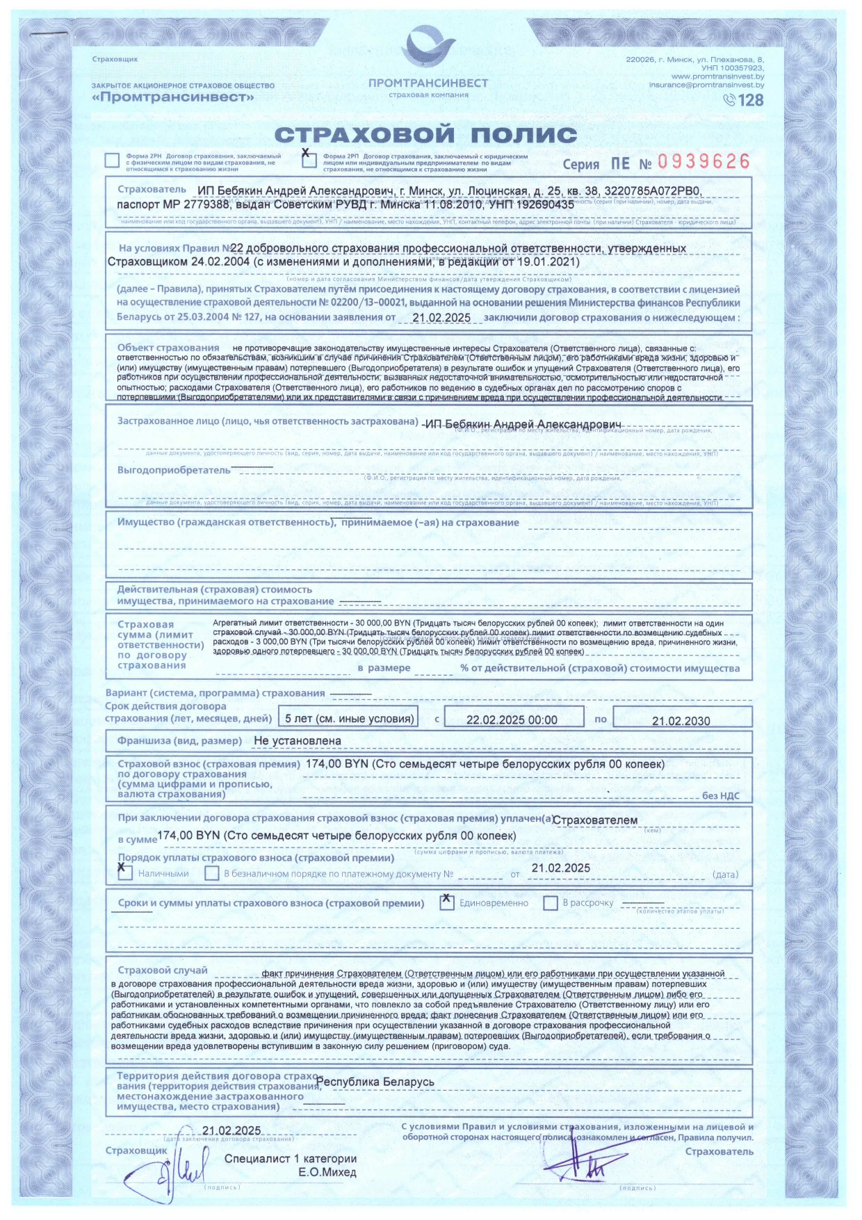 Сумма действующего страхового полиса серия ПЕ №0939626 с ЗАСО "Промтрансинвест".